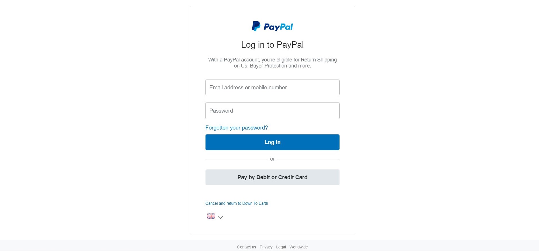You do not need a PayPal account to purchase from Down To Earth, as PayPal allows you to enter your credit or debit card details without signing in to a PayPal account, or creating one.